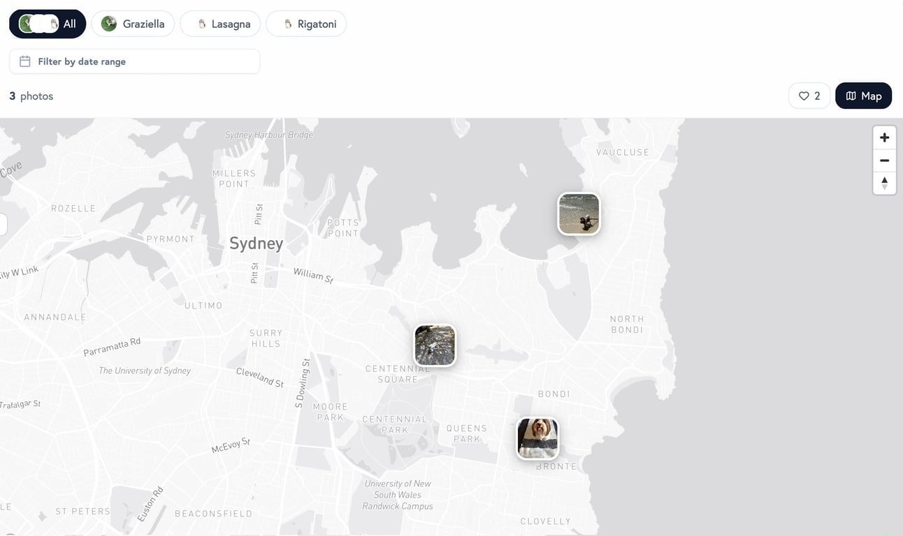 For dog walking businesses, this is magic. A pet owner can see that last Tuesday, their dog was photographed at Centennial Park, then at Bronte Beach, then back at the park. The photos are not just thumbnails on a map; they are the actual photo, displayed as a rounded marker at the location where the moment happened.
